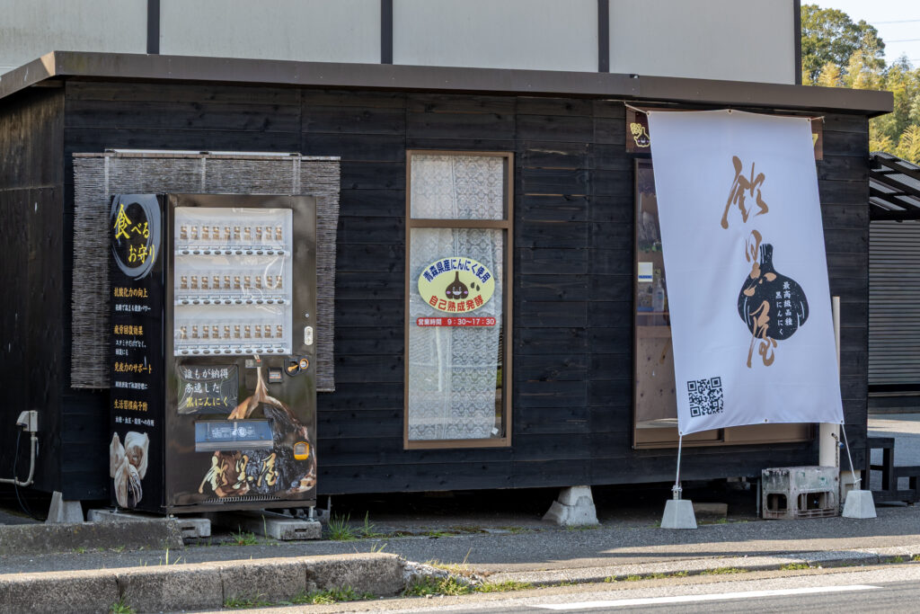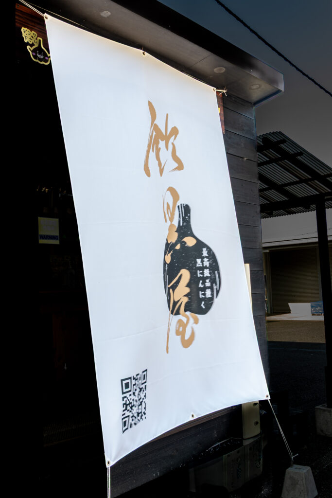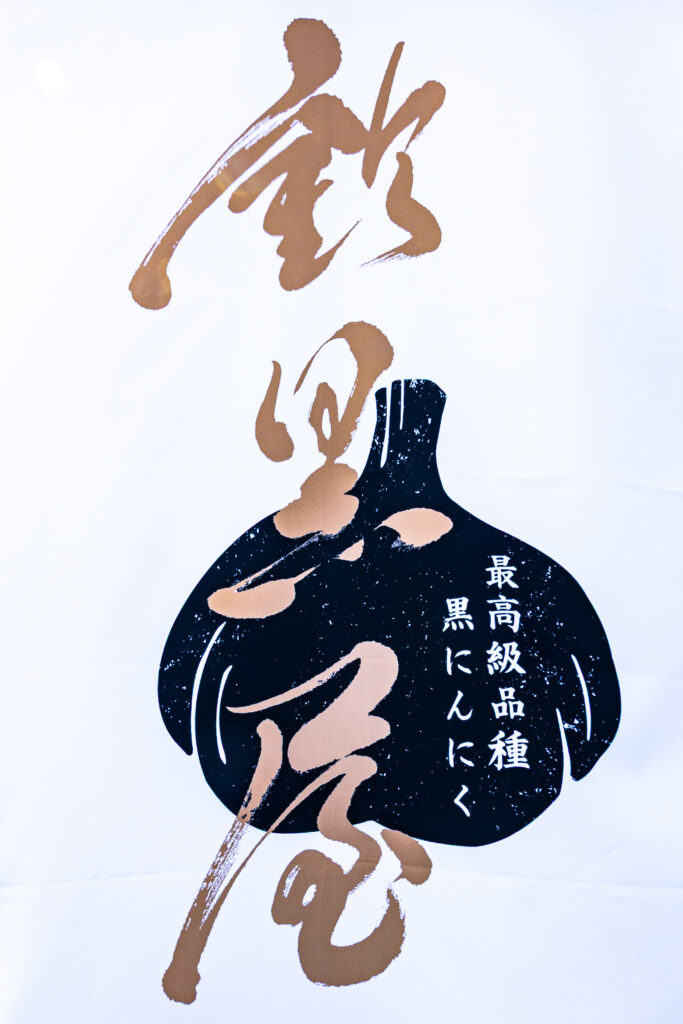 白地に金の筆文字で「黒にんにく」を表現した、シンプルながら鈴黒屋らしい一枚となっています。